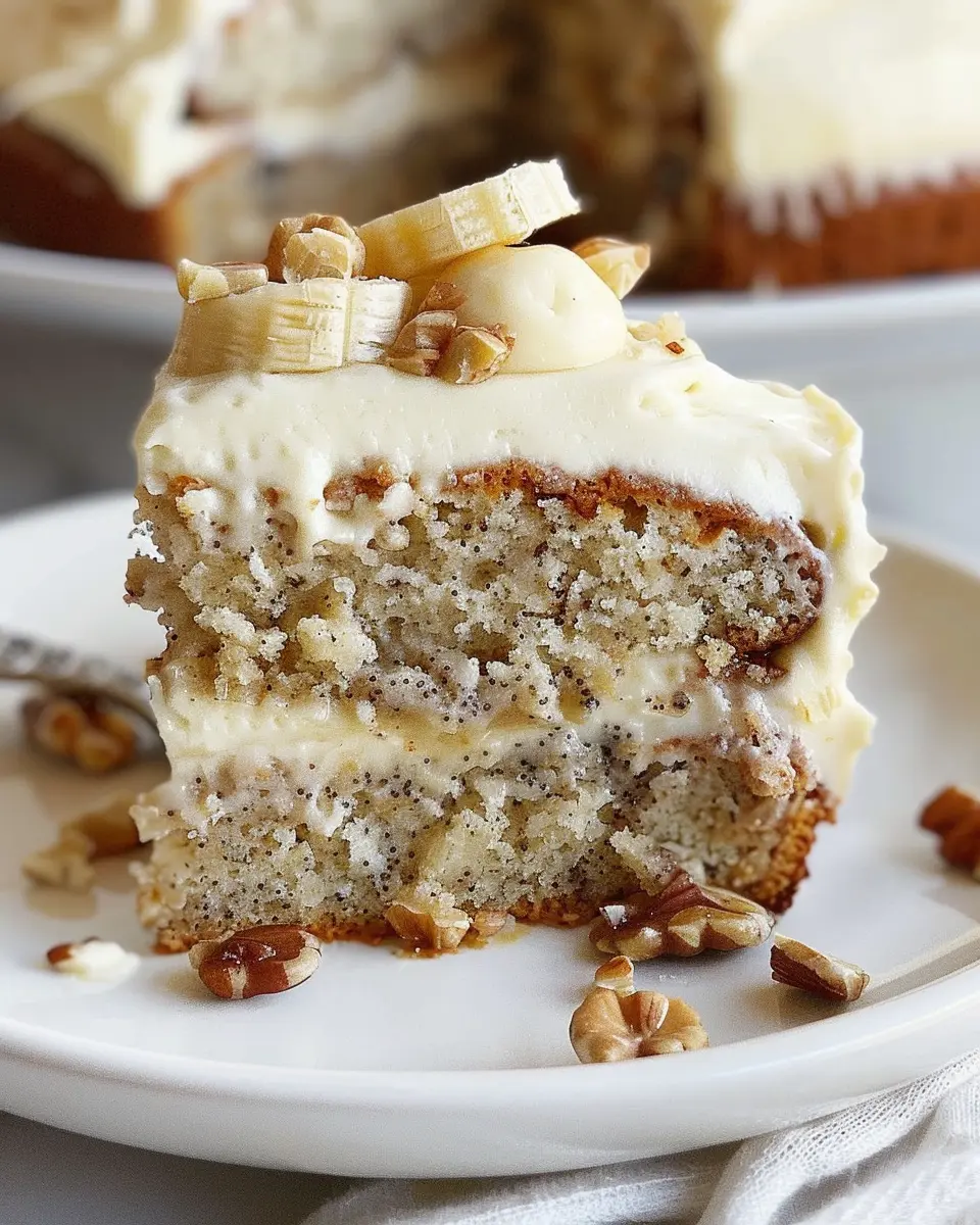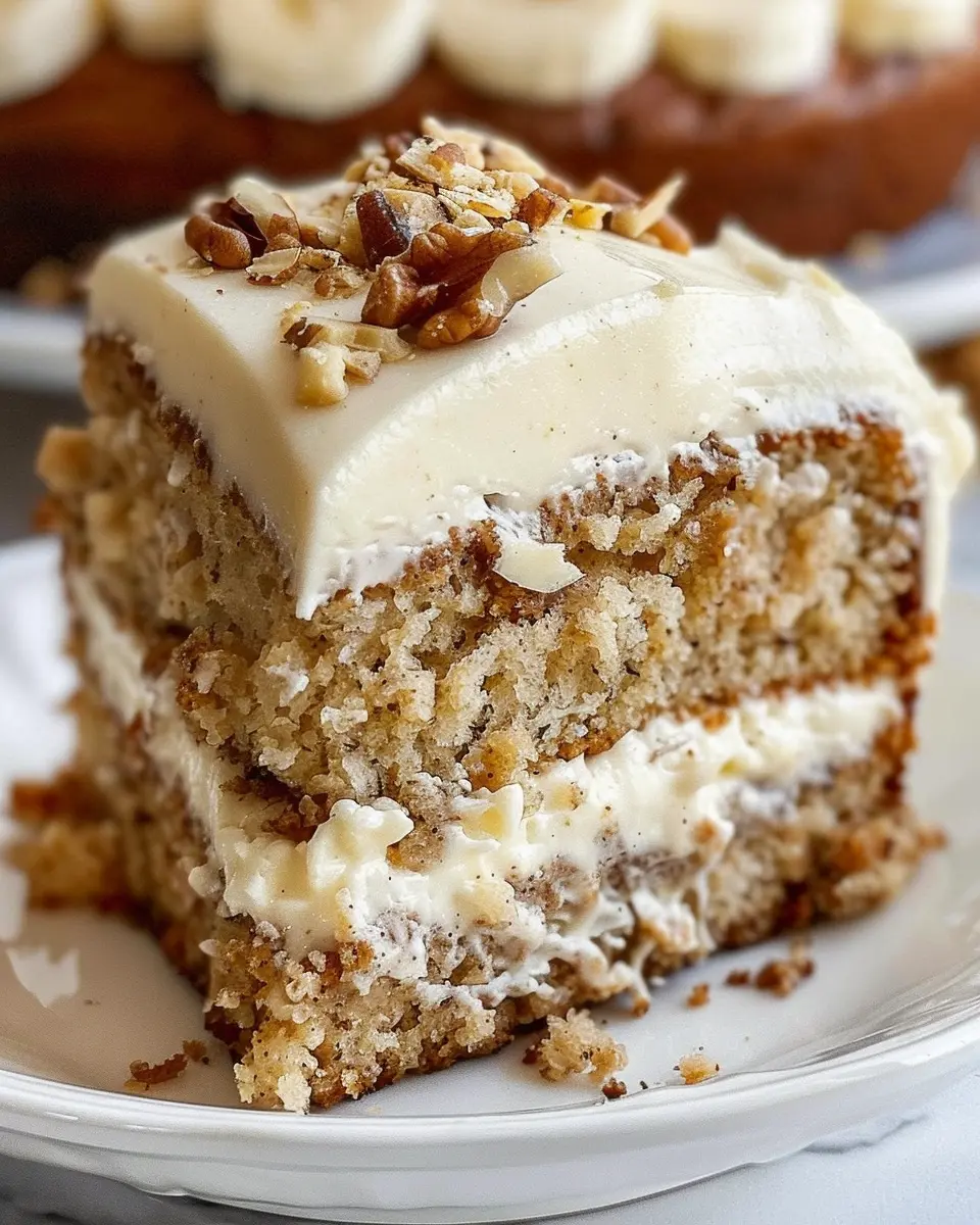 Once the cake has cooled completely, it’s time for the fun part: frosting! Spread the cream cheese frosting generously over the top of your cake. For an elegant touch, consider garnishing with some sliced bananas or a sprinkle of chopped nuts.