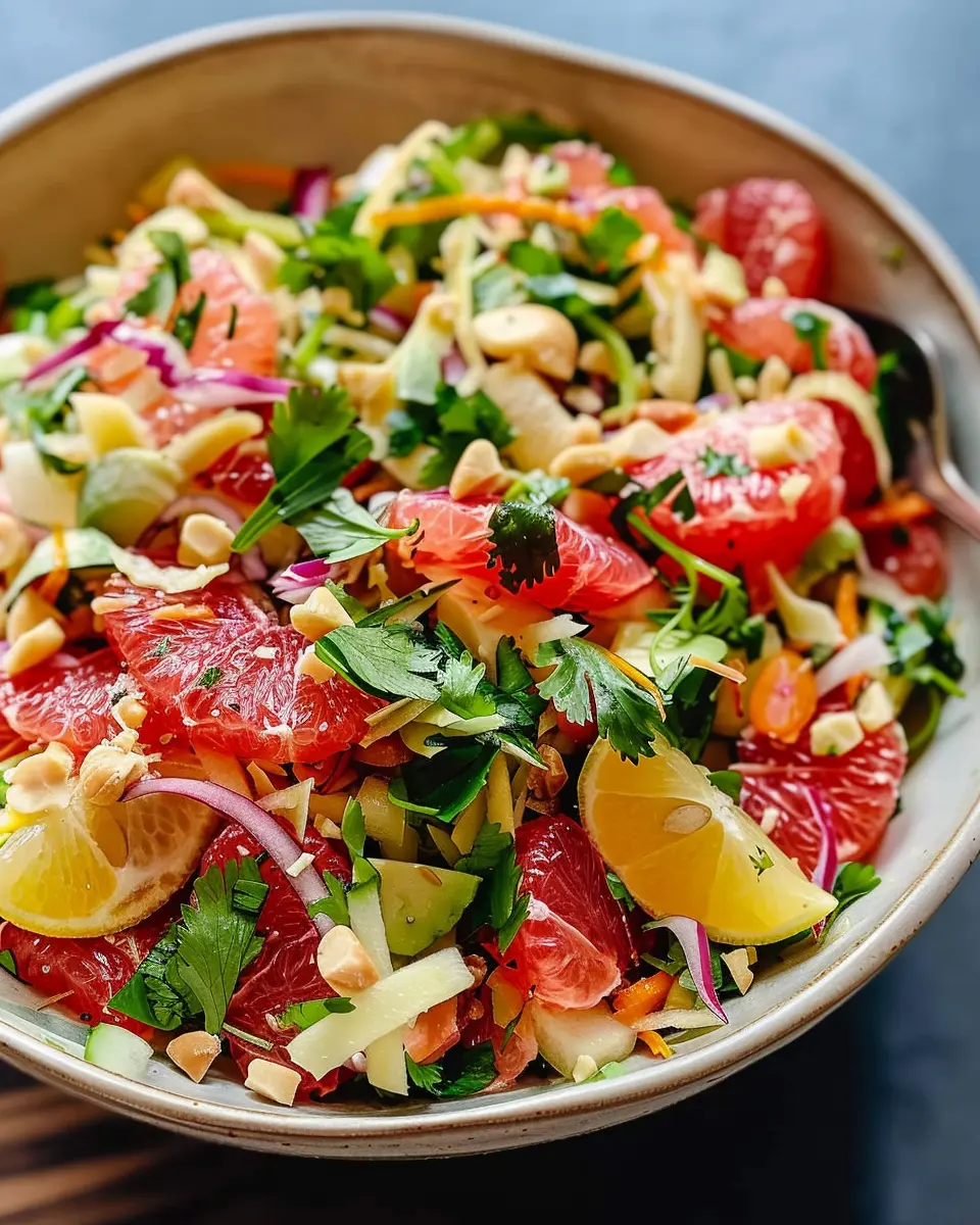 Now comes the best part—combining everything to create your Raw Thai Citrus Crunch Salad. Start by placing all your prepped vegetables into a large bowl. Add the grapefruit segments and any collected juice from segmenting. Pour the delicious dressing over the top and use tongs to mix everything gently.