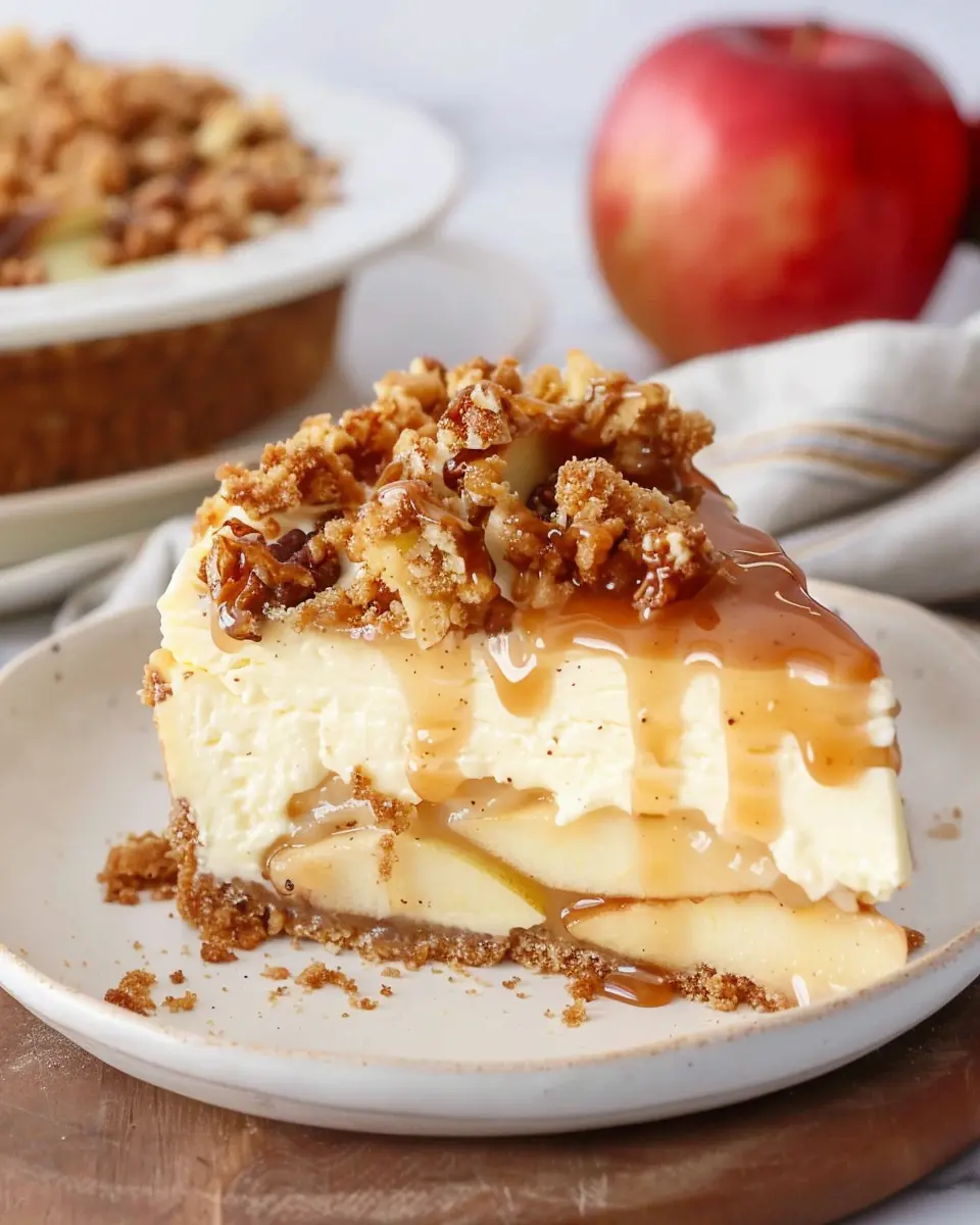Absolutely! One of the best things about this apple crisp cheesecake is that it can be made in advance, allowing the flavors to meld beautifully. You can prepare the cheesecake a day or two ahead of time, just be sure to leave the crisp topping off until you’re ready to serve! This way, your topping stays crunchy and delightful. Once baked, refrigerate the cheesecake covered tightly with plastic wrap. Just remember to let it sit at room temperature for about 30 minutes before serving for the best flavor and texture.