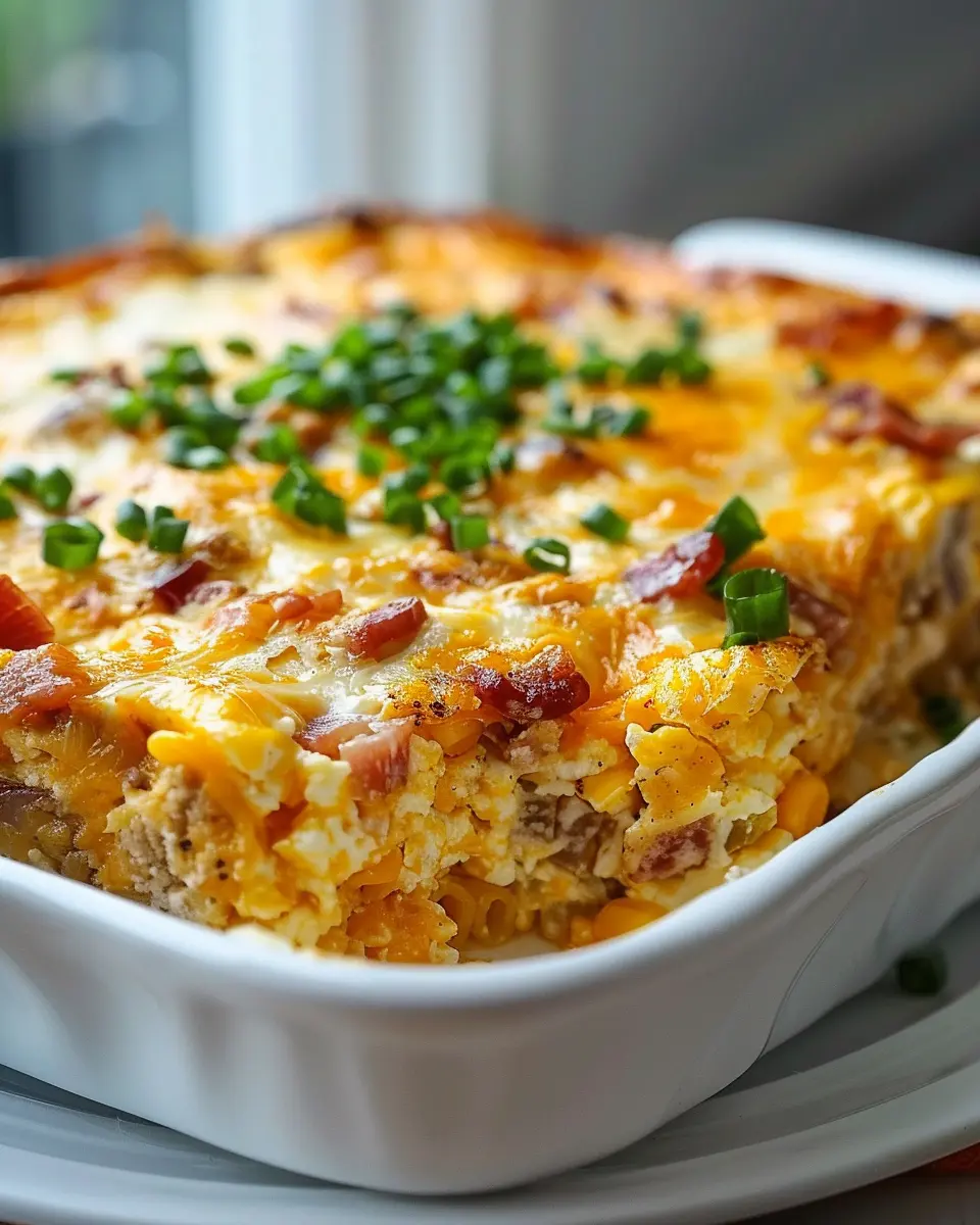 A delicious breakfast casserole featuring turkey bacon and chicken ham, perfect for a family meal.