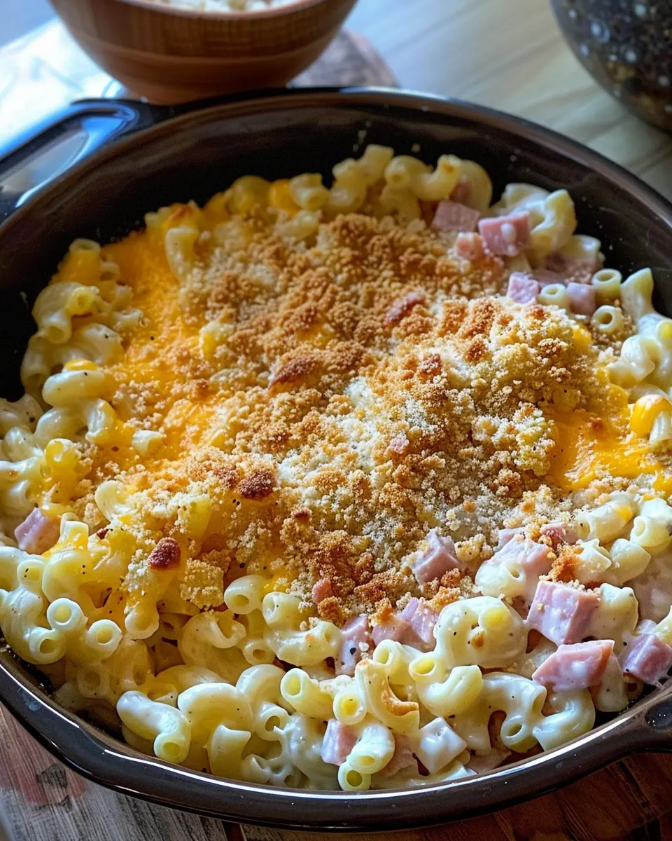 A deliciously creamy and cheesy baked macaroni dish with ham, perfect for the whole family.