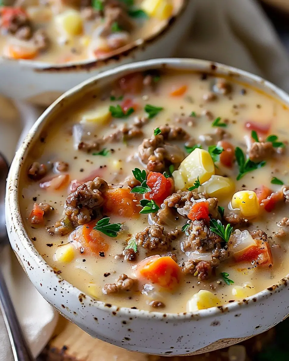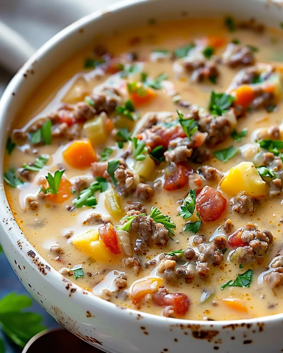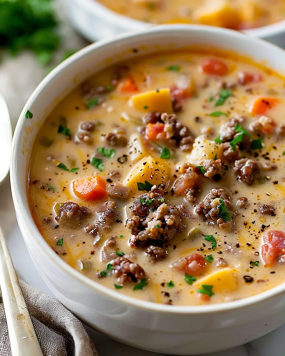 Crafting this cheeseburger soup recipe in your kitchen offers a delightful blend of comfort and creativity. The rich, savory flavors of seasoned ground beef and creamy cheese come together to create a dish that’s both hearty and satisfying.