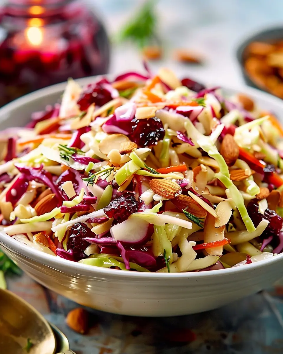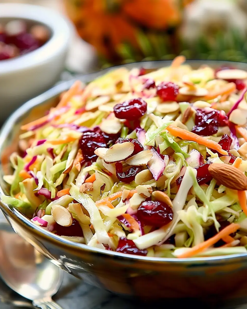 A refreshing slaw that combines the tartness of cranberries with the crunch of almonds, perfect for Thanksgiving.