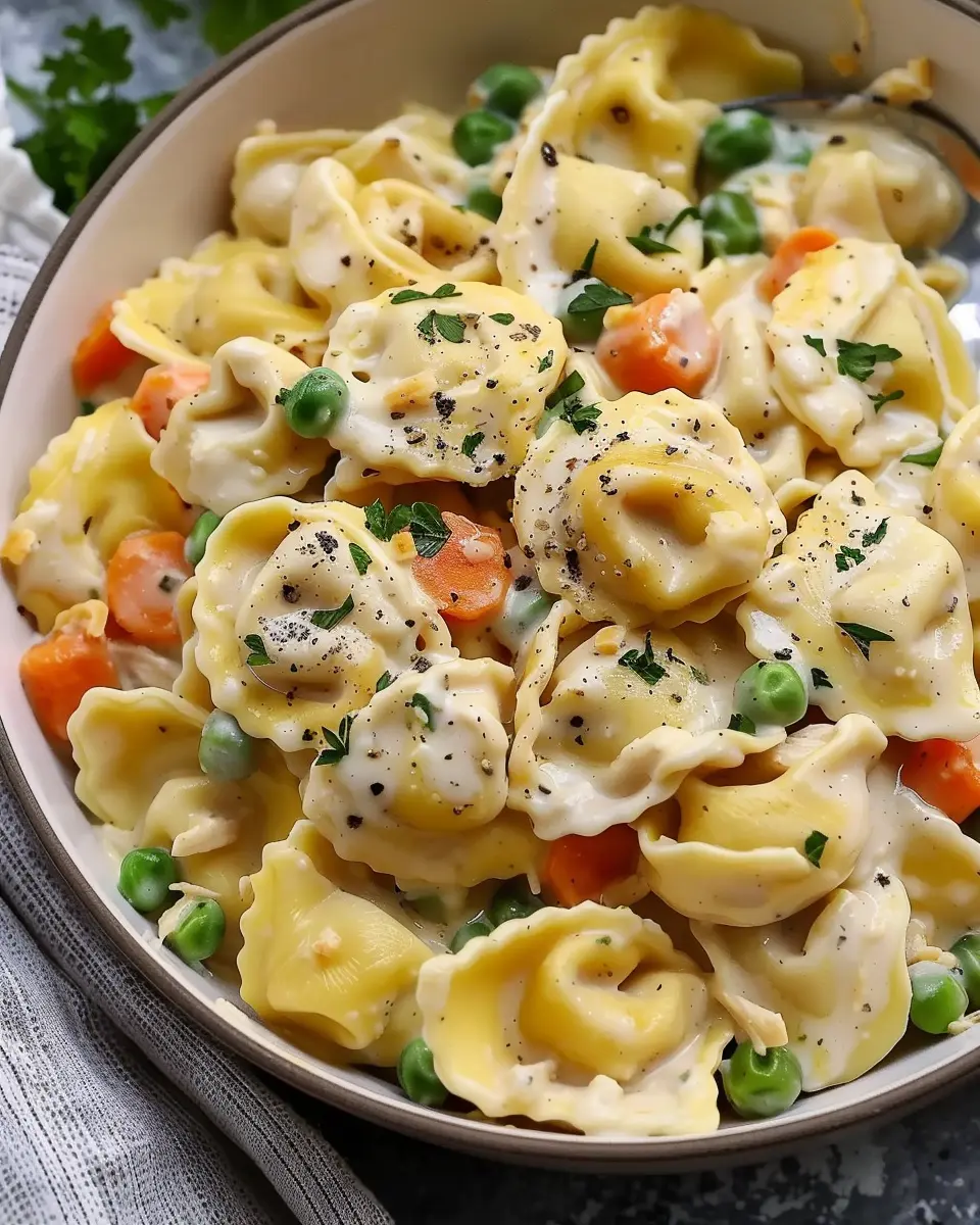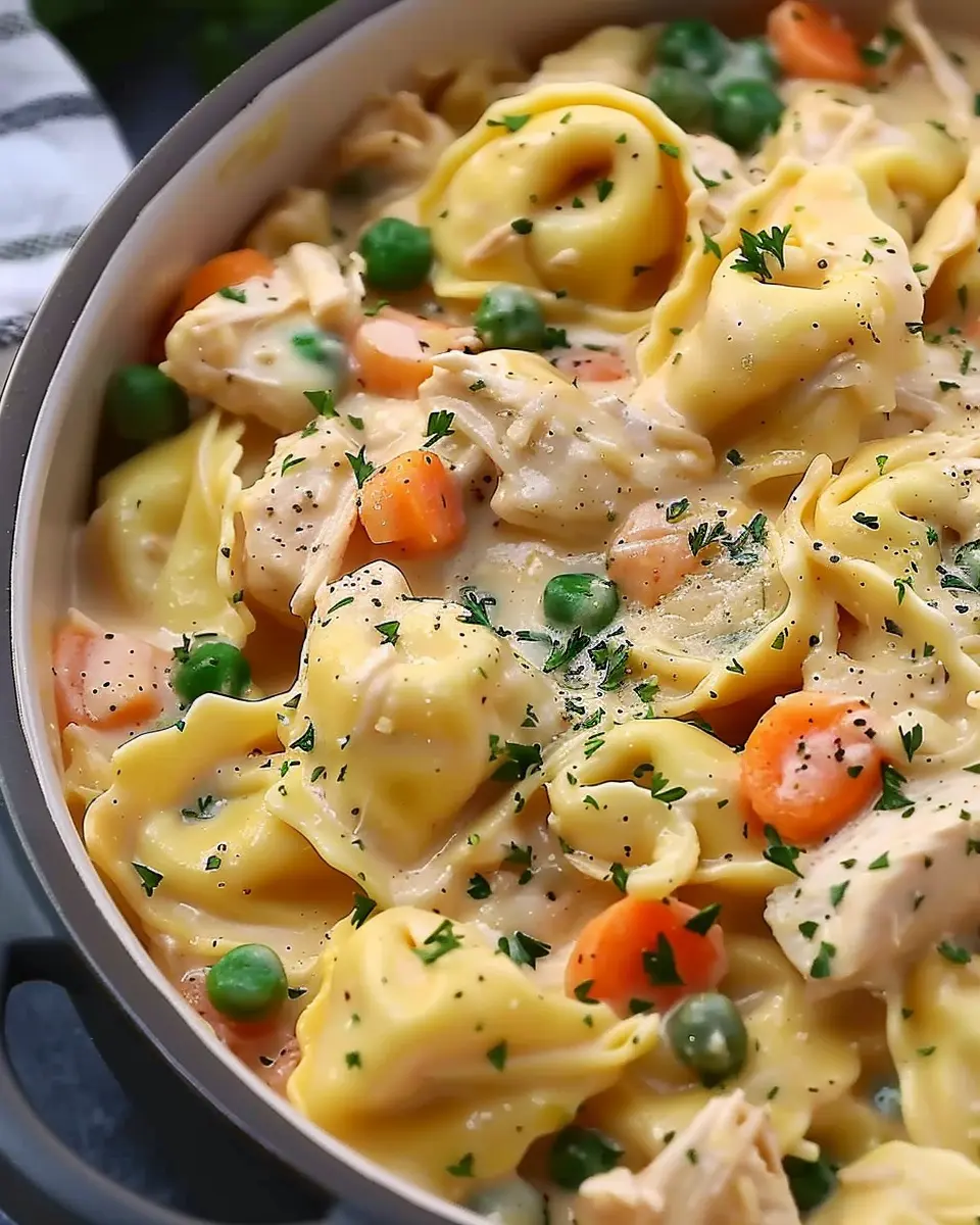 A warm and hearty crockpot dish that combines classic pot pie flavors with tortellini and cheddar.