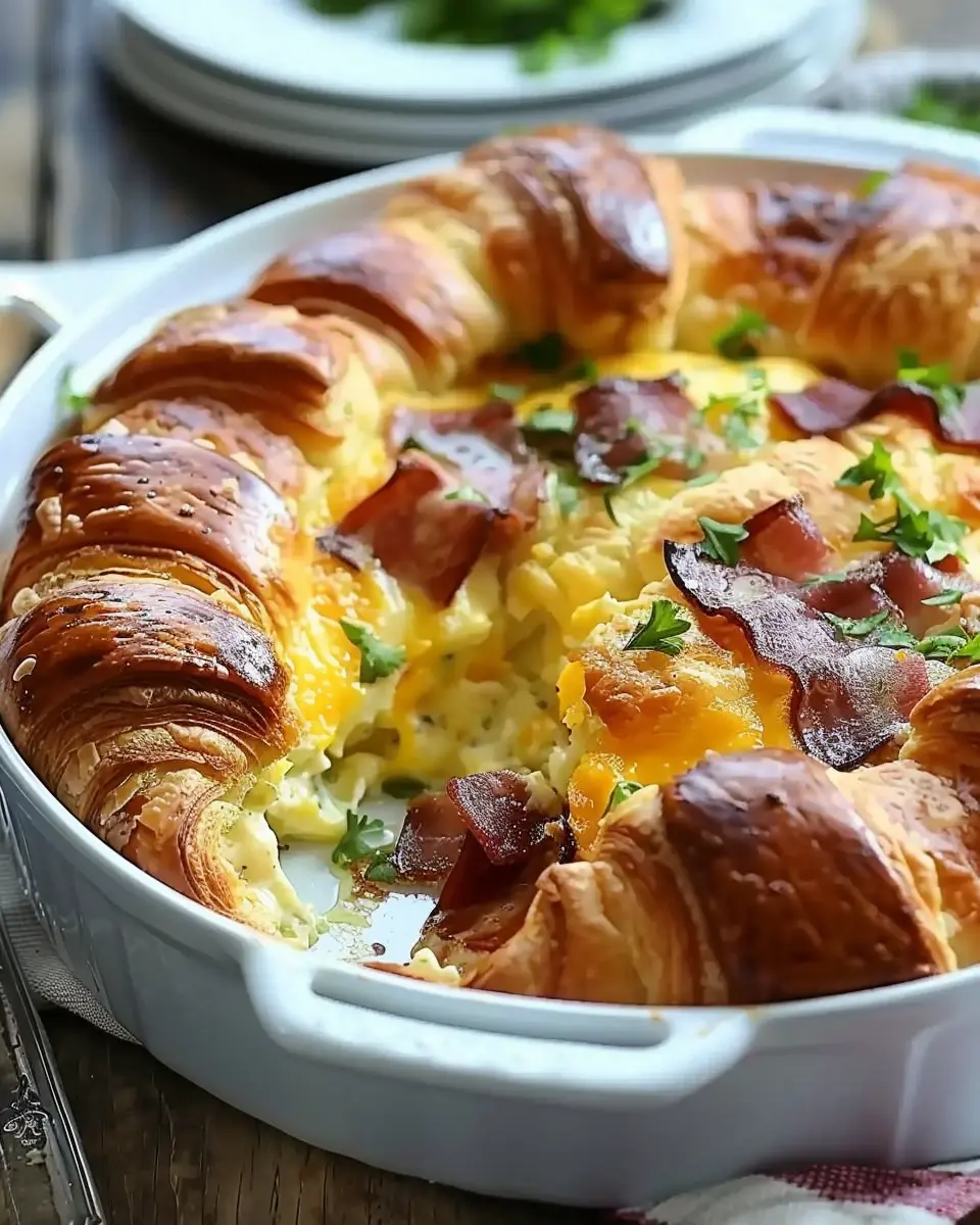PrintCroissant Breakfast Casserole: Easy Turkey Bacon & Chicken Ham Delight