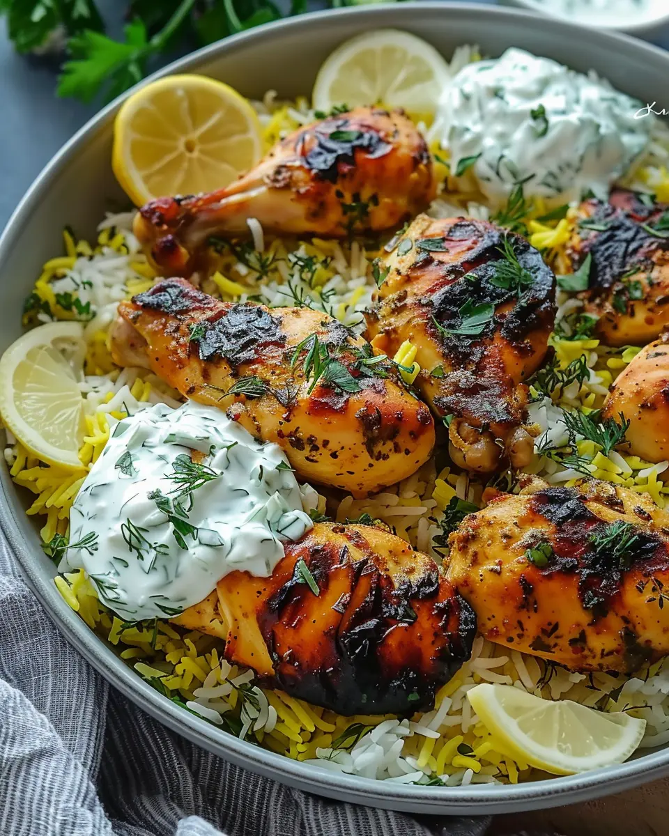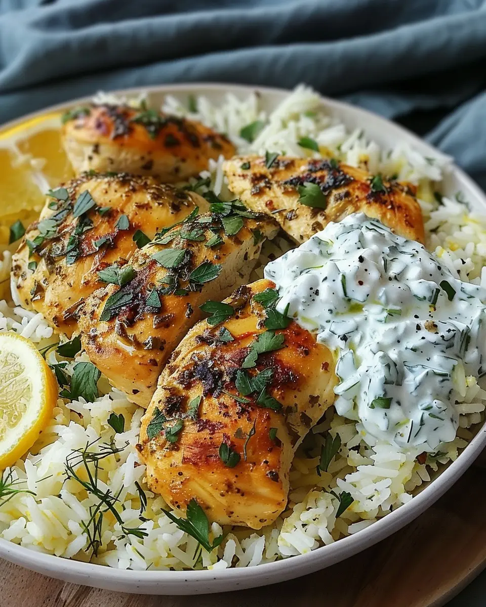 An easy and flavorful chicken and rice recipe with a delicious tzatziki sauce.