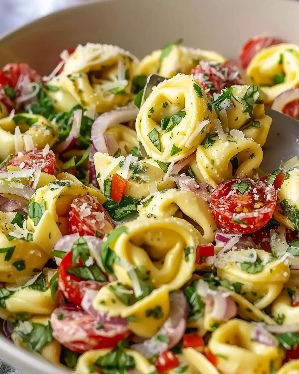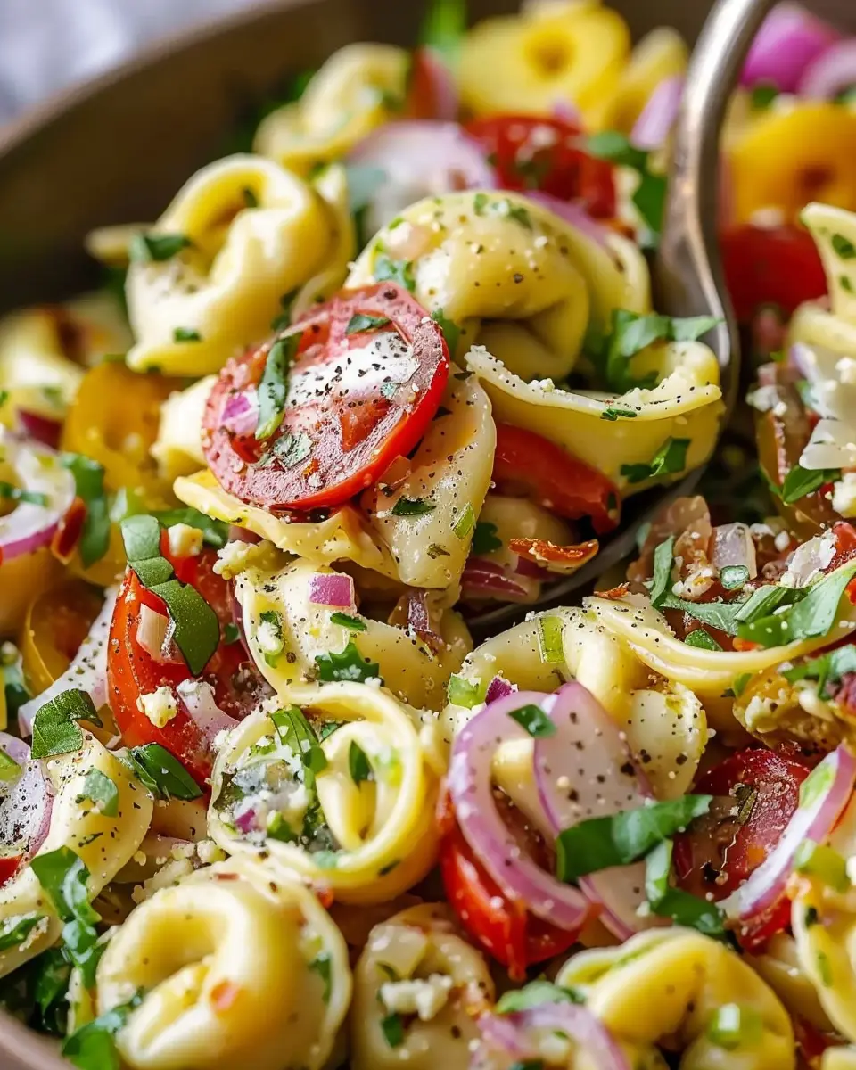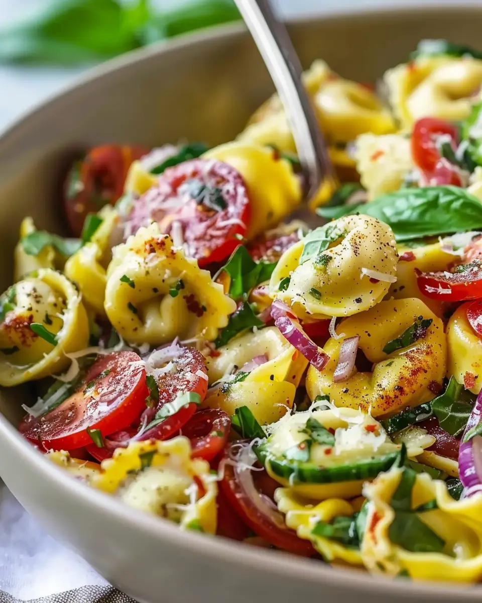 A delicious salad featuring fresh tortellini, vibrant vegetables, and a flavor-packed dressing.