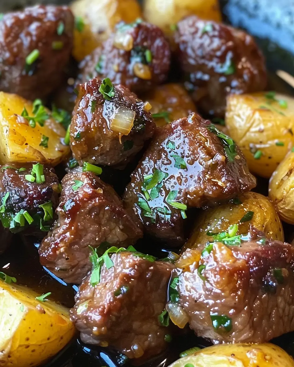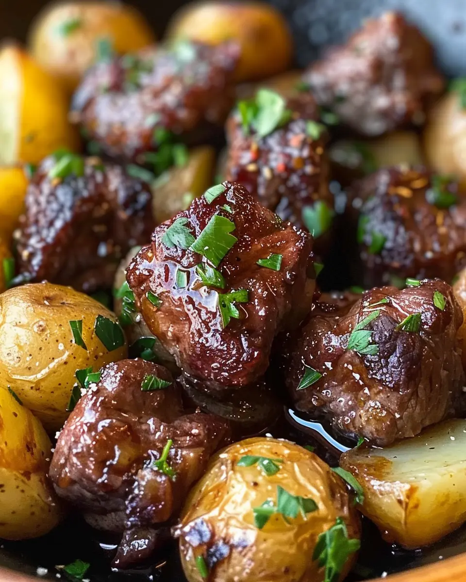 PrintGarlic Butter Beef Bites: Juicy Delights with Roasted Potatoes