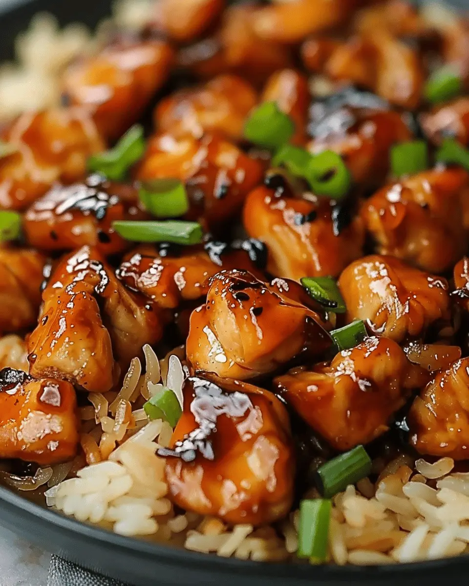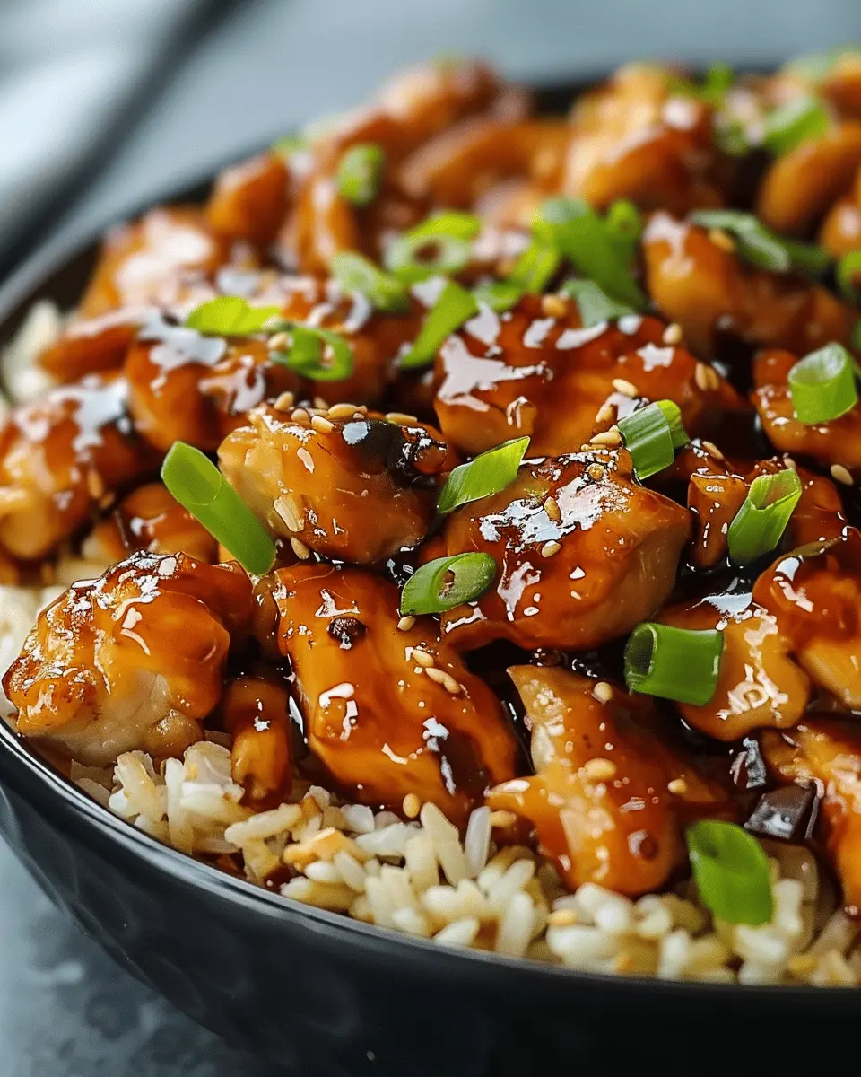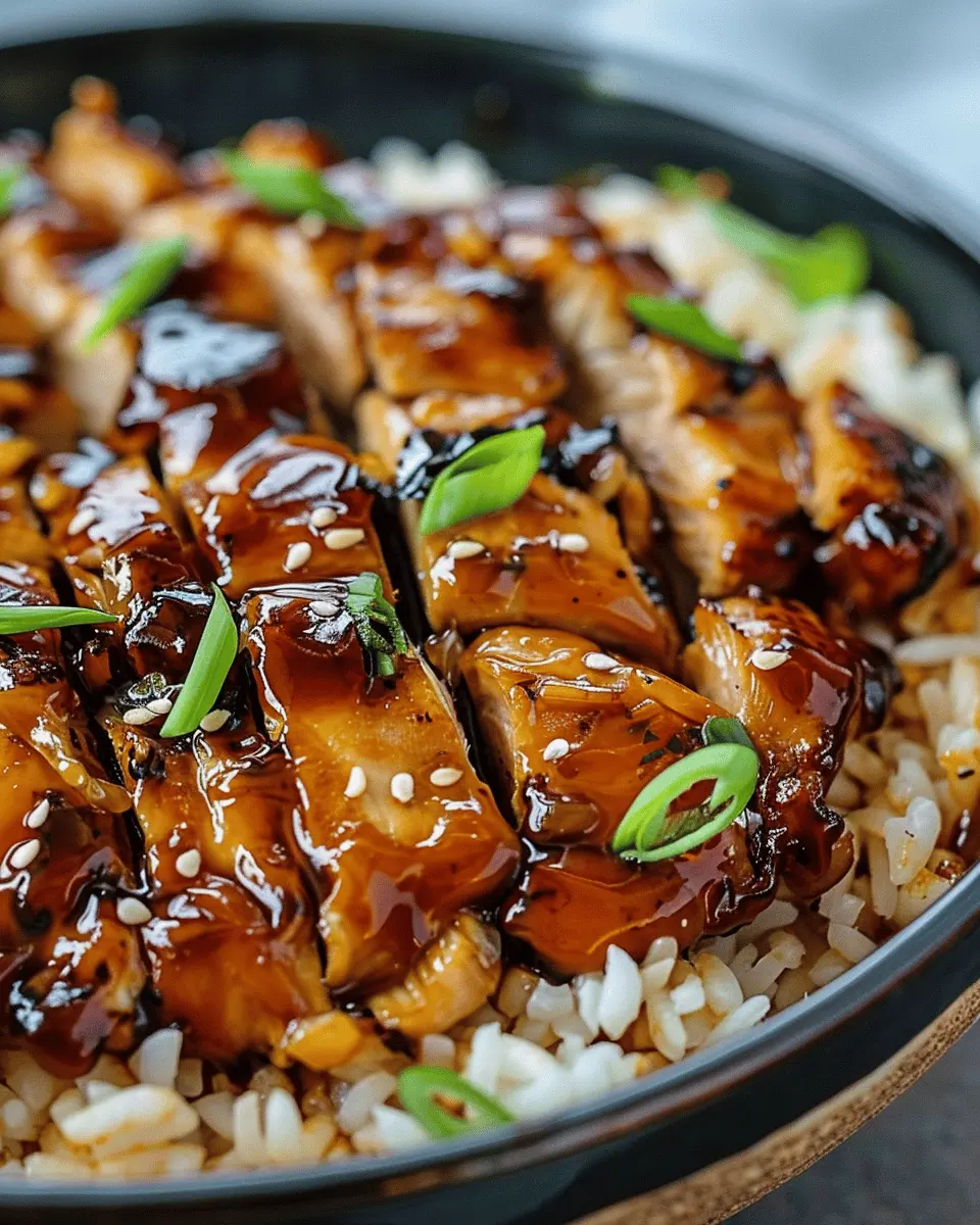 A delicious and comforting meal of honey BBQ chicken served over rice.