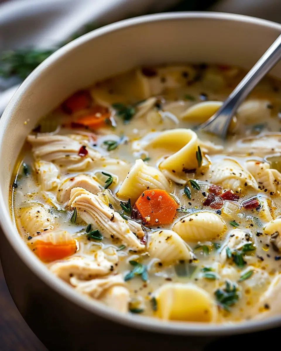 4. Stir in shredded chicken, thyme, rosemary, pepper, and noodles.