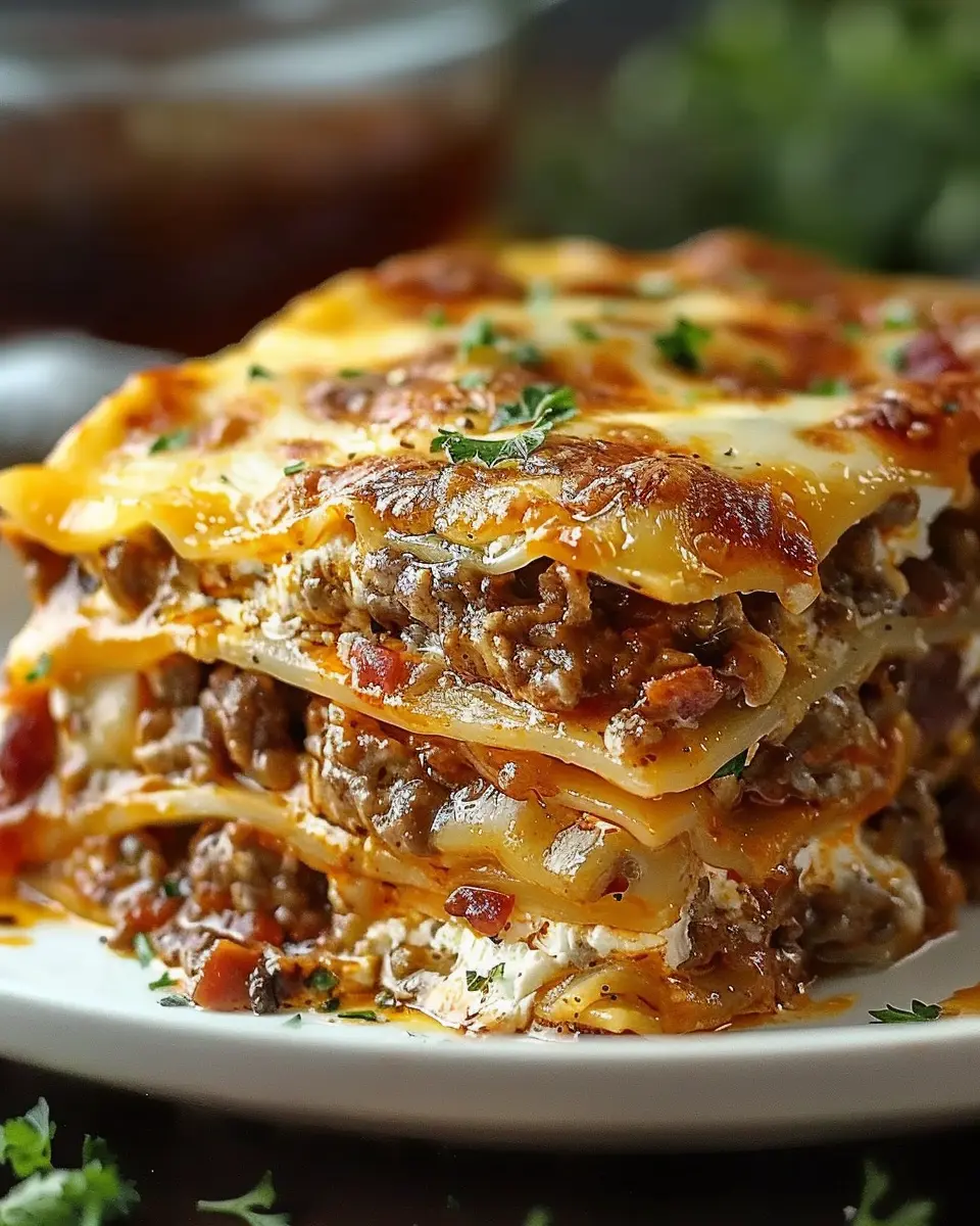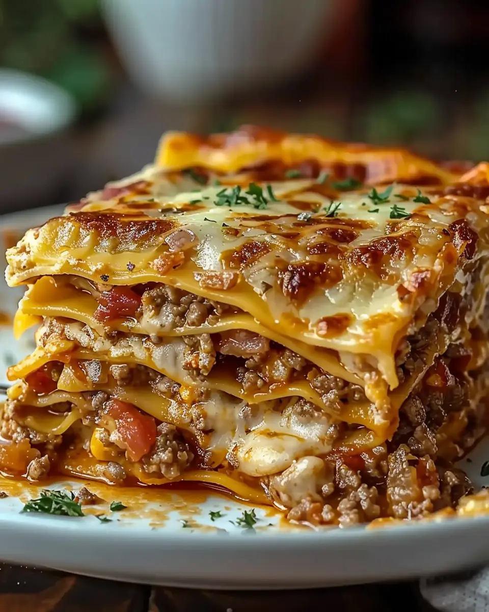 This indulgent lasagna combines the flavors of a cheeseburger with the comforting layers of pasta and cheese.