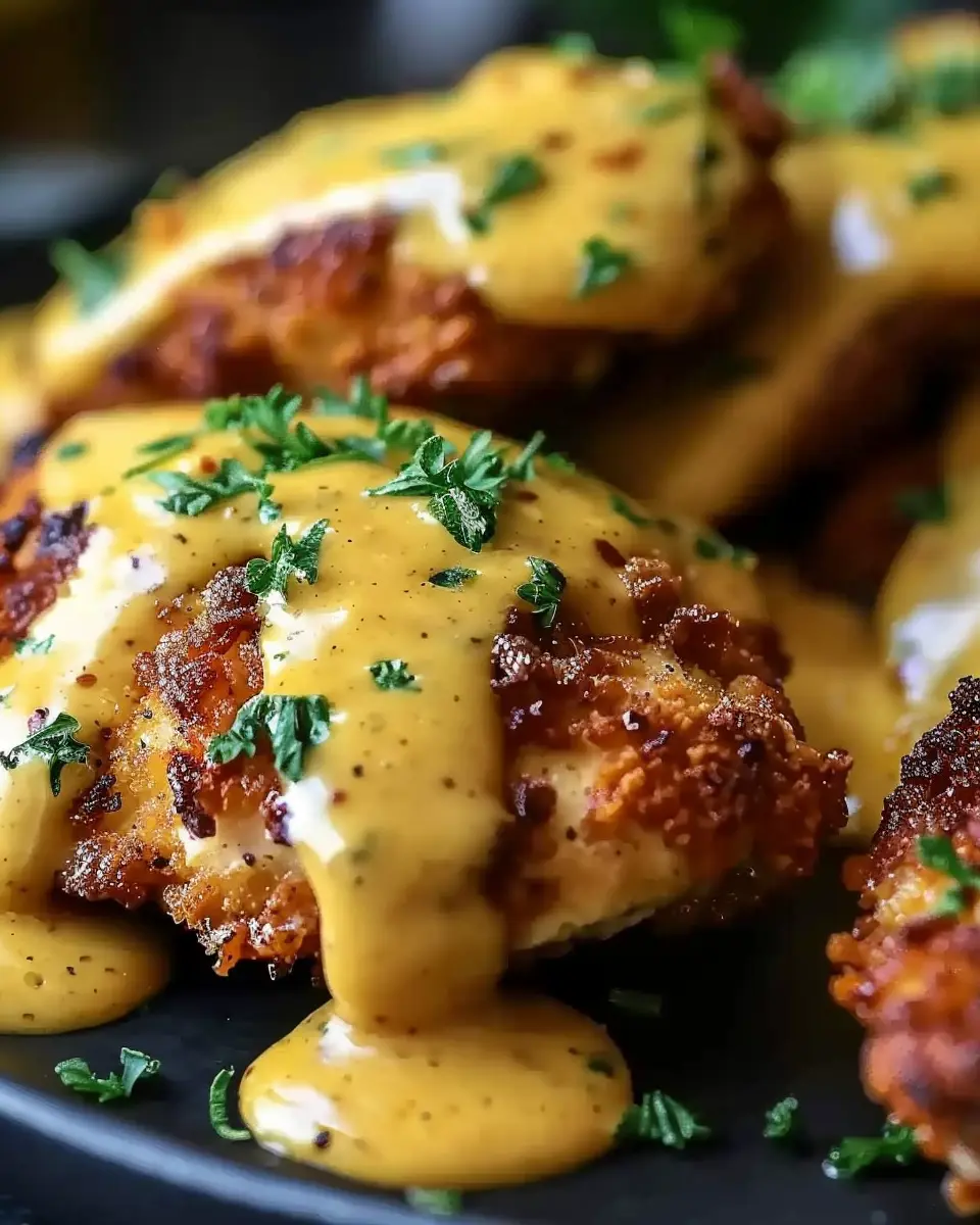 To elevate your dining experience, how you plate Pretzel Chicken with Mustard-Cheddar Sauce can make a significant difference. Start with a white or neutral-colored plate to let the vibrant colors shine. Place the chicken slightly off-center, drizzle the mustard-cheddar sauce over the top, and add a sprinkle of freshly chopped herbs for a pop of color. Surround the chicken with your chosen sides, arranging them artfully to create balance and appeal.