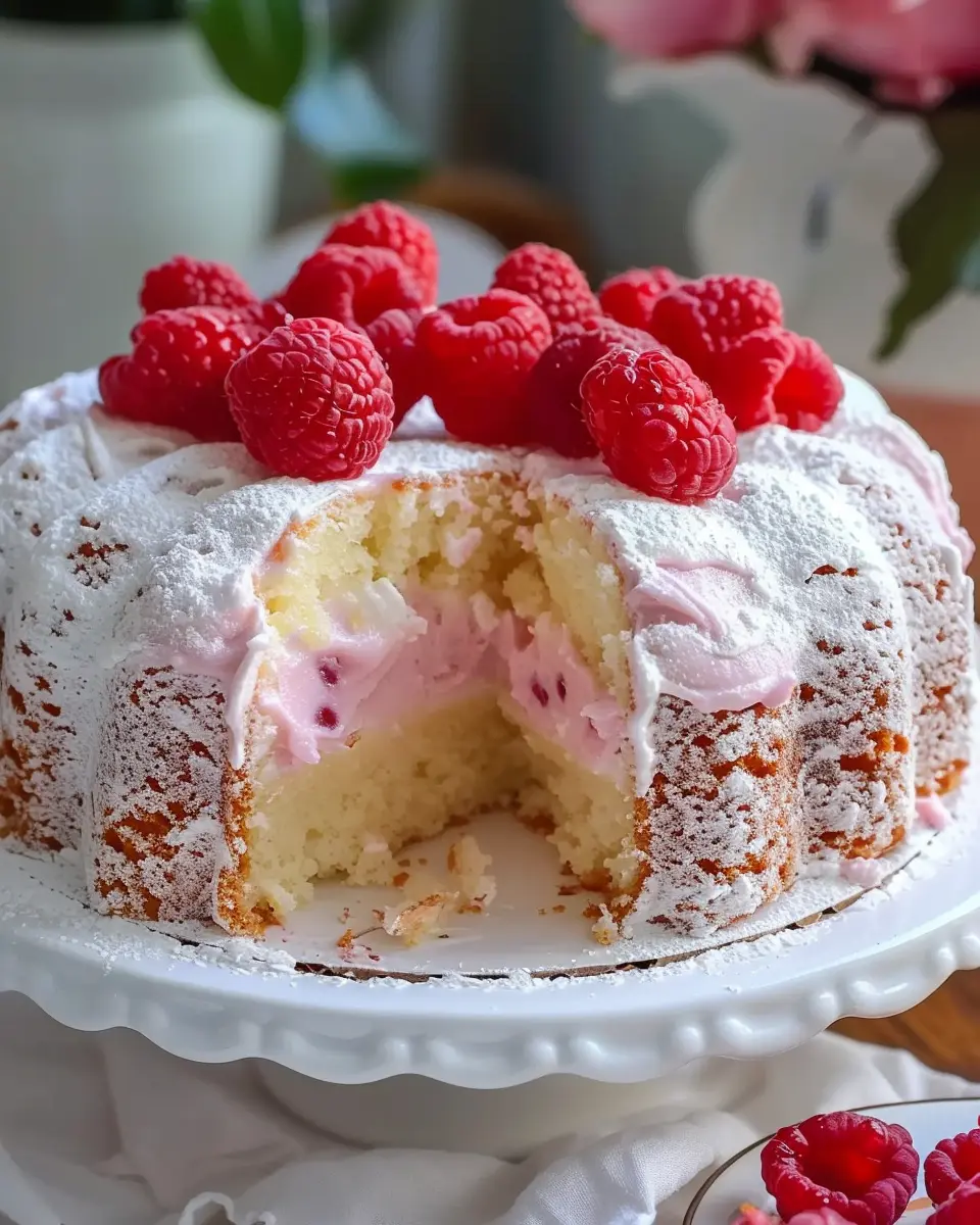 Raspberries add a luscious pop of color and a tangy sweetness that perfectly complements the cake’s delicate crumb. Whether you’re preparing for a summer gathering or just craving a light dessert after dinner, this cake is perfect for any occasion. You can enjoy it plain, topped with whipped cream, or served alongside a scoop of vanilla ice cream—endless possibilities!