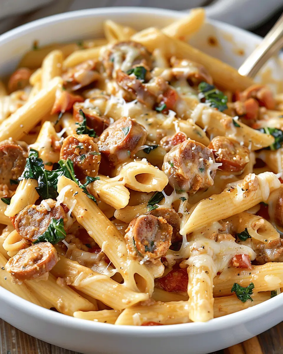 Experience the rich flavors of Tuscan sausage pasta in a creamy sauce, perfect for a cozy dinner.